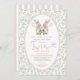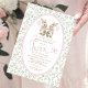 Celebre la emoción de su próxima llegada con nuestra encantadora invitación a bañarse en una ducha gemela. Con dos adorables conejillos hechos a mano con un suave arco rosado, esta invitación marca el tono perfecto para una ducha reconfortante. Rodeado por un delicado borde floral de inspiración vintage en tonos rosa, azul y verde, el diseño transmite un ambiente dulce e intemporal. El dramático guión "Twin Baby Shower" en la coordinación de tonos pastel añade un toque de elegancia y anticipación a su evento especial.