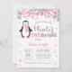 Invitación de primer cumpleaños del Chica Penguin de Onederland. Copo de nieve rosa y gris. Invitación a la fiesta de cumpleaños del chica. Día feriado de invierno. Fondo blanco. Para una mayor personalización, haga clic en el botón "Personalizar" y utilice nuestra herramienta de diseño para modificar esta plantilla.