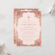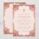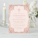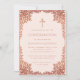 Esta elegante invitación de confirmación de oro rosa y rosa, con aire vintage, recomendada para un chica, tiene un marco dorado rosa ornamentado (falso) con ramas serpenteantes con hojas de oro sobre un fondo rosa rubor. Encima del texto hay una cruz religiosa de oro rosa. Todo el texto puede ser personalizado y tiene un color rosa similar al dorado rosa. El marco vintage y ornamentado de hojas doradas se basa en un enlace de portada de libros antiguos, "The XVIII Century its Institutions, Personalizados, and Costumes" de Paul LaCroix, publicado en 1876, ahora de dominio público.