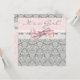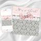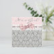 Bonita invitación de baby shower de niña con damasco rosa gris, cinta de ojal rosa y encaje blanco. Agregue sus datos en el anverso y reverso añadiendo los detalles del evento, estilo de fuente, tamaño y color de la fuente, y redacción.