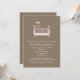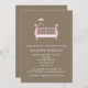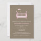Diseño adorable de la invitación de la fiesta de bienvenida al bebé que ofrece un ilustracion dulce de un pesebre rosado del bebé en un fondo marrón elegante. Efectos de escritorio a juego disponibles en nuestra tienda.
