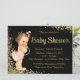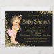 Invitación de shower de bebé rosa y oro con hermosa letra dorada y adorable bebé vestida con pantalones de volantes rosados y collar de perlas sobre un fondo brillante dorado. Puedes personalizar fácilmente esta elegante invitación de shower de bebé con detalles en la fuente y color que desees. También puedes cambiar el color del fondo. Este es un diseño impreso sin perlas ni brillo reales.