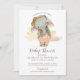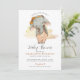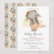 Una adorable invitación a la ducha de bebé con elefante de color agua adorable, con un lindo elefante bebé en los overoles con el cabello reverdecido, en tonos grises y naranjas. El patrón de elefantes se lleva a la parte posterior de la invitación.