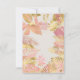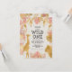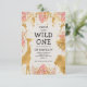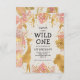 La invitación a la fiesta de primer cumpleaños de este chica con temática de "salvaje uno" en la jungla incluye animales de Relieve metalizado falsos de oro (jirafa, león y monos), follaje de jungla dorada y rosa, y una rociada de confeti de oro en un fondo crudo. Agregue el nombre del chica de cumpleaños y los detalles del fiesta en texto negro. Al revés aparece un patrón de marco de coordinación de hojas rosadas y doradas.