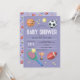 Este diseño de invitación a la ducha para bebés, chicas lindos y modernos, presenta un patrón de personalizado de deportes morado, con baloncesto, fútbol, fútbol, baloncesto, raqueta de tenis, trofeo y estrellas. La invitación se puede personalizar con los nombres de los padres y otros detalles necesarios para su fiesta. La perfecta diversión en la temática de los deportes, además de la ducha de bebé para los niños de parejas de hecho.