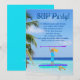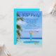 Invitación de fiesta de cumpleaños de SUP para adolescentes para un cumpleaños o reunión de verano. Un fondo de palmera y agua del océano con texto azul oscuro. Mi ilustración es de una chica rubia parada en una tabla de remo morada sosteniendo una pala morada sobre su cabeza. Una tortuga marina nada junto a ella.