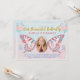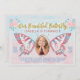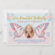 ¡Estas invitaciones para fiestas de cumpleaños únicas transforman a tu hijo en una mariposa mágica! El diseño de los bonitos tiene un estilo de cuentos de hadas vintage en tonos rosas, azules y dorados. La foto de su hijo llena el centro de las alas de la mariposa. El diseño es bonito y está hecho en acuarela con detalles purpurinas falsos y adornos florales. El purpurinoso de oro de la parte superior dice: "Nuestra bella mariposa", con espacio para el nombre y la edad de su hijo. A continuación, añada todos los detalles del fiesta. CONSEJO: Si necesitas añadir más información, también puedes personalizar la parte posterior.