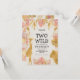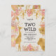 La invitación a la fiesta de segundo cumpleaños de este chica de temática "dos salvajes" de la jungla incluye animales de Relieve metalizado falsos de oro (jirafa, león y monos), follaje de jungla dorada y rosa, y una rociada de confeti de oro en un fondo crudo. Agregue el nombre del chica de cumpleaños y los detalles del fiesta en texto negro. Al revés aparece un patrón de marco de coordinación de hojas rosadas y doradas.
