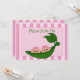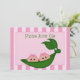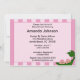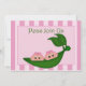 Invitación a Baby Shower de Chicas gemelos Green Pea. Los gemelos están sentados en una vaina de arveja y llevan arcos rosas. La invitación de Baby Shower tiene un fondo de banda rosa. Personalizar con los datos de su fiesta.