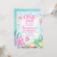 Chicas Octopus Pink Oneder The Sea 1st Birthday Invitation Cute bajo la invitación de cumpleaños del mar con tortuga marina, pulpo, almeja, caballito de mar y varios peces en un fondo mayormente azul. Ideal para una fiesta de primer cumpleaños con temática marina, para una niña pequeña, pero que se puede utilizar para cualquier edad.