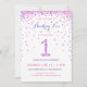 ¡Celebra el cumpleaños de tu hijo de un año con coloridos confeti rosado y morado en estas invitaciones de primer cumpleaños! Con los detalles del fiesta de su hija y un "1" en confeti. La parte posterior tiene un diseño de confeti con un suave color de lavanda. Este adorable diseño es super lindo y jovial - y perfecto para el chica que ama rosa y morado!