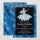Un moderno ilustracion de una bella princesa rubia con un brillante albornoz holográfico que tiene un envoltorio que parece brillar y brillar alrededor de sus hombros. Está situada sobre un vibrante fondo azul oscuro, bordeado por un purpurina brillante de color plateado falso que tiene fuentes blancas para su redacción personalizada. Son ideales para fiestas de cumpleaños de niñas y cualquier celebración importante de un hito desde una quinceañera a una fiesta temática del 13, 16, 21 o cuento de hadas.