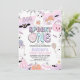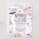 Chicas Retro Morado Hablaron Halloween Primer Cumpleaños Invitación Chica Halloween temática Invitación para un bebé con algunos fantasmas groovy, calabazas, escoria, murciélagos, cobardes y globos. Esta invitación para el primer cumpleaños de Halloween también incluye texto multicolor de estilo retro y una ola como patrón de tablero de ajedrez en la parte posterior. Es ideal para una fiesta de primer cumpleaños de Octubre o Halloween para una niña.