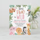 Invitación al segundo cumpleaños de chicas Pink Green Born To Be Wild Cute safari nacido para ser una invitación de 2º cumpleaños salvaje con seis animales de la selva, patrón de impresión de chita rosa y marrón, follaje tropical y texto no editable. Esta invitación de segundo cumpleaños silvestre es ideal para una fiesta de segundo cumpleaños temática de la jungla para un chica.
