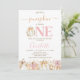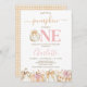 Chicas de color rosa otoño invitan a la calabaza pequeña a cumplir 1° cumpleaños a la dulce otoño con el tema de la primera invitación de cumpleaños para la bebé que incluye cuatro calabazas con un toque de flores silvestres y una palabra grande. Este chica nuestra pequeña invitación de cumpleaños de calabaza es ideal para un cumpleaños de otoño.