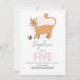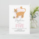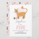 Una encantadora invitación de cumpleaños para los chicas con un juguetón ginger tabby cat con una pelota rosa en el frente y espacio para la personalización. En la parte trasera se observa un patrón de gato omnipresente que le da mucho encanto. Diseñado como una invitación de quinto cumpleaños pero fácil de personalizar para cualquier edad. Perfecto para un gatito o un fiesta con temática de gatito.