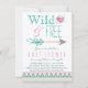Chicas invitación tribal a la ducha de bebé con fondo de diseño azteca rosa pastel y azul verde azulado del suroeste de Azteca con elegante escritura Wild and Free con corazón de bonito y flecha. Usted puede fácilmente personalizar esta adorable invitación para su evento de Boho Wild and Free tribal baby ducha con solo añadir sus detalles. También puede añadir un color de fondo y quitar o mover el corazón de la parte posterior.