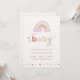 Estas adorables invitaciones para baby shower tienen un estilo boho de moda y una letra manuscrita de moda. Un arcoíris pintado lindo y neutral de terracota está decorado con flores de acuarela naranjas y duraznos sobre un fondo blanco simple.