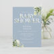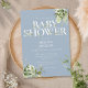 Una elegante invitación para baby shower con tipografía elegante y bonita vegetación botánica en un fondo azul polvoriento. Diseñado por Thisisnotme©