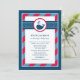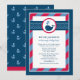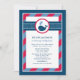 Esta linda invitación de baby shower náutico presenta una ballena marina amistosa con salpicaduras de agua en forma de corazón, colocada sobre un diseño audaz de lunares y rayas azules y rojas. La combinación clásica de colores náuticos es perfecta para celebrar el nacimiento de un niño. Un patrón de ballena coordinado adorna la parte trasera de la tarjeta. Todo el texto es totalmente personalizable para su evento.
