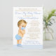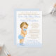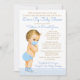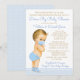 Invitación de baby shower de paseo en coche con adorable bebé rubio con máscara y traje azul sobre fondo azul pastel y dorado. Este divertido baby shower de paseo en coche se personaliza fácilmente para su evento simplemente cambiando el texto. Puede cambiar el color del texto, elegir el estilo de fuente, la redacción, etc.