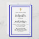 Una invitación moderna, elegante y de confirmación. Un fondo blanco decorado con marcos azul real y una cruz dorada. Personalice y agregue un nombre y detalles. Letras de color negro.