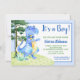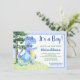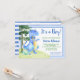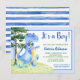 Invitaciones para baby shower de dinosaurio niño con adorable dinosaurio de acuarela que lleva una corbata de lazo linda en una franja de acuarela azul y fondo al aire libre. Esta invitación de baby shower de dinosaurio se personaliza fácilmente para su evento simplemente agregando sus detalles.