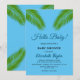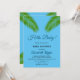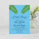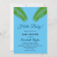 Esta elegante invitación de baby shower de playa es perfecta para una moderna fiesta de bebé veraniega junto al mar. El diseño romántico presenta hojas de palma verdes con tipografía negra y azul elegante sobre un fondo de color azul verde.