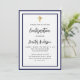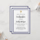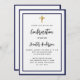 Una invitación moderna, elegante y de confirmación. Un fondo blanco decorado con marcos azul marino y una cruz dorada. Personalice y agregue un nombre y detalles. Letras de color negro.