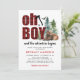 Invitaciones rústicas de ducha de bebé de leñador con un fondo blanco chic que se puede cambiar a cualquier color, un bosque de acuarela, oso y pájaros, las palabras "oh chico" en un patrón de franela roja de gingham, y una plantilla moderna de fiesta de bebé que es fácil de personalizar.