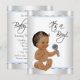 Invitación de baby shower de niño étnico con adorable bebé étnico en un hermoso fondo plateado y azul bebé. Puede personalizar fácilmente esta elegante invitación de baby shower azul y plateada simplemente agregando sus detalles en el estilo de fuente que elija.