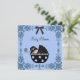 Divertidas invitaciones de baby shower de niño negro y azul. Esta invitación de baby shower azul y negro presenta a un dulce bebé en un cochecito negro y azul con un borde elegante y lazo negro, y se personaliza fácilmente para su evento simplemente agregando los detalles del evento, estilo de letra, tamaño y color de letra, y texto.