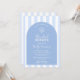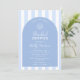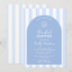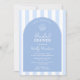 Una elegante invitación de Baby Shower de tema costero chic azul y blanco que presenta una forma de arco de moda y rayas azules pálidas y blancas con una concha marina dibujada a mano. Todos los colores (rayas, arco de fondo, iconos y por supuesto los colores de la fuente) pueden ser editados por usted desde dentro de la herramienta de diseño.