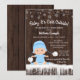 Invitaciones para baby shower de invierno para niños con adorable bebé vestido con un traje de nieve azul bebé con sombrero sobre un fondo rústico de madera y copos de nieve. Estas lindas invitaciones para baby shower con copos de nieve de invierno se personalizan fácilmente para su evento simplemente agregando sus detalles. Este diseño funciona bien para una invitación de revelación de género de copo de nieve o invierno.