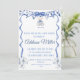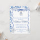 Invitación elegante de chinoiserie azul y blanco con hermoso azul marino y un osito de peluche.