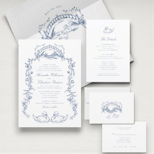 Elegant Chinoiserie wedding invitations featuring a romantic blue bridge and swans motif. This all-in-one design sets a timeless and sophisticated tone for your special day, perfect for couples seeking a classic yet unique celebration. The delicate floral wreath encloses your wedding details, while the accompanying RSVP card and QR code streamline guest communication and provide access to your wedding website. Announce your upcoming marriage with this beautifully illustrated stationery, ensuring every guest feels informed and cherished. Make your wedding planning seamless with this exquisite blue and white wedding invitation suite.