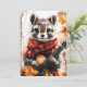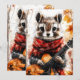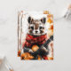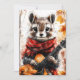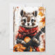 Un chipmunk con una bufanda roja toca una guitarra entre las hojas de otoño. Las acogedoras vibraciones del bosque le dan un encanto animal divertido.