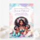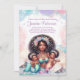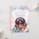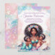Invitaciones de cumpleaños de gemelas sirena con una hermosa madre sirena africana sosteniendo a dos adorables bebés sirena en un bonito fondo de burbujas pastel y conchas. Esta invitación de cumpleaños de gemelas sirena se personaliza fácilmente para su evento simplemente agregando sus detalles. También puede agregar un color de fondo en la parte delantera y trasera.