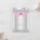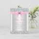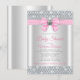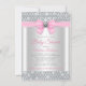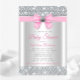 Invitación de chorreo de bebé rosa y plateado con un lazo de diamante rosa y plateado en un fondo elegante de brillo de diamantes. Esta invitación de chorreo de bebé de brillo rosa y gris se personaliza fácilmente para su evento.
