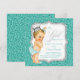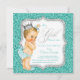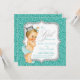 Invitación al baby shower azul turquesa y plata con una adorable bebé vestida con pantalones de volantes azul turquesa y corona plateada sobre un hermoso fondo azul turquesa y plata. Esta adorable invitación para baby shower azul turquesa se personaliza fácilmente para su evento con solo agregar sus datos. Este elegante diseño es perfecto para un baby shower con tema de Tiffany.