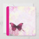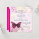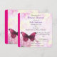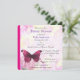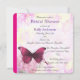 Un convite de boda femenino y encantador. El fondo es una mariposa morada pintada con maestría que realmente capta tu atención. Sobre un delicado fondo que tiene una textura de acuarela única y creativa con flores rosadas y amarillas desvanecidas románticas. Con un logotipo antiguo apenas visible en la parte inferior para darle un toque vintage