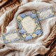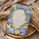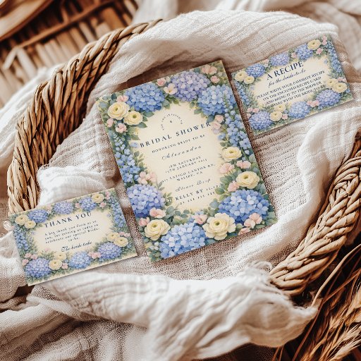 Un diseño de despedida de soltera inspirado en un jardín romántico que presenta hortensias azules polvorientas y exuberantes combinadas con rosas marfil suaves y delicadas flores de prado. Las flores enmarcan la composición en una elegante disposición simétrica con detalles clásicos sutiles, creando una estética refinada y atemporal. El fondo cálido de pergamino realza la suavidad de la paleta azul mientras mantiene un ambiente elegante y elevado. Perfecto para una celebración sofisticada con una fresca elegancia de jardín.