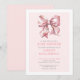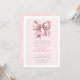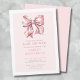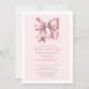 Un tema de fiesta de bebé con lazo rosa lindo y femenino que presenta un adorable bebé o un lazo de acuarela rosa suave mezclado con un fondo rosa suave. Una mezcla de fuentes grises y rosadas con una tipografía serif en negrita y una fuente moderna simple. ¡Celebra a la futura mamá con estilo! Disponible también en más esquemas de colores. Puedes cambiar los colores de la fuente a lo que te guste. También puedes cambiar el color de fondo en la parte delantera y trasera. Hermosa invitación de tema de fiesta de bebé con lazo rosa suave de acuarela para la futura mamá.