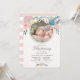 Esta elegante y encantadora invitación a los chicas presenta un fondo crema con tu foto y flores primaverales en rosa, blanco y azul. En el reverso se ve un fondo blanco con rayas de color rosa chillón. Personalízalo para tus necesidades. Puedes encontrar productos coincidentes en mi tienda.