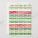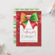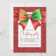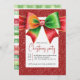Christmas red and green bow and snowflakes party holiday invitation. It features a large red and green bow with a snowflake in the center of it. There is a wide red border around it with white snowflakes. The back features a striped pattern of red and green irregular stripes and snowflakes.