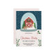 Christmas party invitation with a cozy barn, snow globe design, and festive elements. Greenery decorates the corners, offering a warm and cheerful tone.