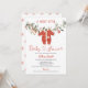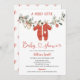 Sweet boys winter Christmas themed baby shower invitation featuring a red and white baby suite, shoes and rattle. Ideal for a December baby shower.