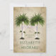 Una invitación judía 'Bajo el Chuppah' y palmeras elegantes de la boda champagne. Dos elegantes palmeras forman parte del dosel de los nombres Over the Bride y Grooms y la fecha boda. Elegante diseño moderno y formal de boda. La información de la parte posterior se cambia fácilmente a las propias palabras y a las suyas. El guión moderno se cambia fácilmente para su propia información personalizado. Invitación casera personalizada de una suite de bodas estacionaria en Just Fine Designs.