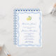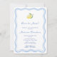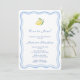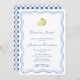 Este diseño de fiesta Bridal Shower es parte de una nueva colección basada en limones siempre populares, esta vez con un toque de mano e incorporando un tipo de letra de escritura a mano y un borde ondulado al estilo doodle. En el reverso se encuentra una huella cuadrada geométrica a la moda en azul pálido, azul cobalto, amarillo claro y blanco con un solo limón.
