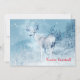 Una invitación a una fiesta de Navidad con una foto temática festiva escénica. Un fondo filtrado azul helado da a esta foto una apariencia de invierno frío con un toque mágico. Un ciervo noble se para en una colina con árboles de pino invernales en el fondo